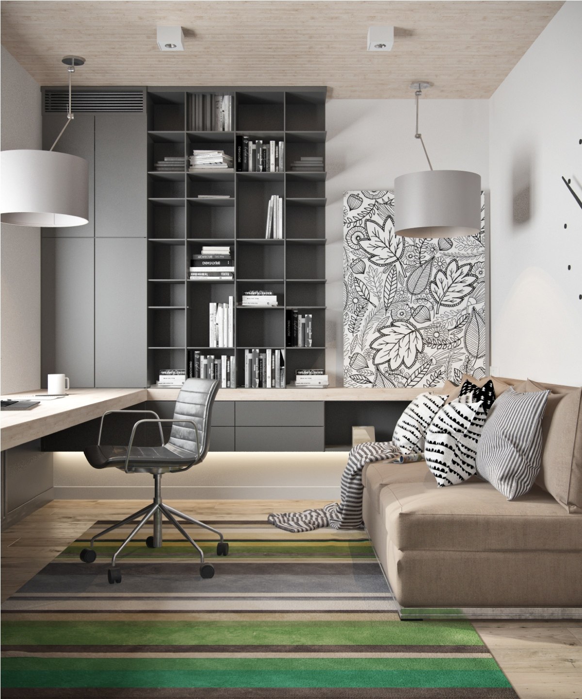 This beautiful home is located near Lviv, Ukraine. Designed by Marta Gord, there is a keen use of cozy gray hues used all throughout the home. Even though moody shades are embraced, the home feels light and airy. Lots of natural light fills the rooms and the tall ceilings make the space feel larger than it is. The use of line art on the walls in the different rooms also brings character to the home. Along with the gray, a light pink is used as an accent color. This breathtaking modern loft with a view is the perfect place for a young family to grow.